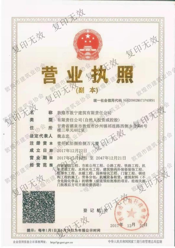 创办于2017年12月,是经省建设厅和相关部门核定的房屋建筑工程施工总承包叁级。公司现有一级建造师2人,二级建造师4人,高级职称2人,中级职称10人,先后被评为甘肃省重质量守信用先进单位,甘肃省工程质量AAA信誉单位,甘肃省诚信经营重点推荐企业。经营范围有房屋建筑工程、市政公用工程、公路工程、铁路工程、机电安装工程、水利水电工程、建筑物内外装修装饰工程、给排水工程、水暖工程、园林绿化工程、门窗工程、钢结构工程的施工;劳务分包;机械设备租赁;建筑材料的销售。
