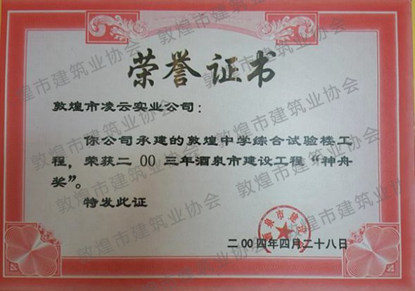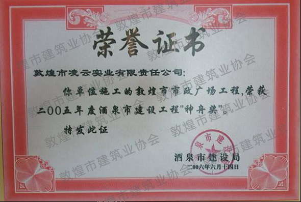 公司成立10多年来,本着“想用户所想,急用户所急”的精神,先后承建了敦煌市种子公司1#、2#住宅楼、市幼儿园教学楼、东街小学逸夫教学楼、教育培训中心综合楼、敦煌中学综合实验楼、阿克塞县迎宾楼、敦煌中学学生餐厅楼、敦煌市农业发展银行住宅楼,中国兵器工业第五研究所沙漠自然环境实验站,敦煌市小北街住宅小区,敦煌市飞天嘉园住宅小区,敦煌市天润花园住宅小区、敦煌市兰怡住宅小区5#、7#楼,敦煌市惠泽园保障性住房4#、6#、8#楼,敦煌市凌云花园商住小区、敦煌东方花苑小区等工程。所承建的工程均以优良的质量受到建设单位及社会各界人士的认可与好评,在社会上取得了良好的声誉,并在此期间获得了省、地、市的“捐资助学先进集体”、“重合同守信誉”“抗震救灾先进集体”“纳税贡献奖”“优秀施工企业”等企业荣誉称号,并获得三项优质工程“神舟奖”及多项“文明工地”奖项,为企业今后的发展奠定了良好的基础。