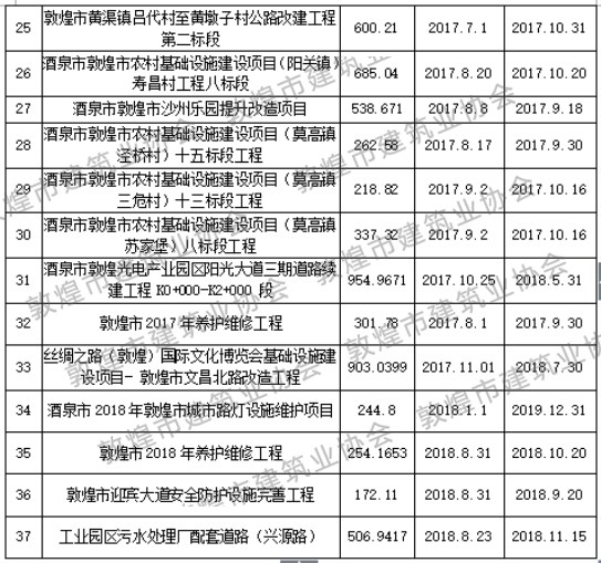 公司自成立以来,本着“以人为本,为社会提供全优服务”的企业宗旨,先后承建了青海油田教育管理中心校舍楼建设工程、2012年敦煌市义乌商贸城建设工程、2012年敦煌市农贸市场改造工程、敦煌火车站站前广场及商铺建设工程、工业园区道路建设工程、光电园区进场道路建设工程、迎宾大道路灯安装工程、飞天广场工程、城区供热管网工程、西湖风电厂道路建设工程、敦煌市光电产业园区服务中心建设项目、敦煌市雷音寺3A级景区基础建设工程、肃北县污水处理厂土建工程、肃北县2013年建制村通畅公路、敦煌市S314线市区过境段路灯安装工程等多项工程。
