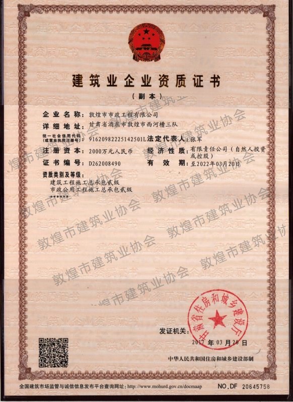 敦煌市市政工程有限公司成立于1993年,自公司成立以来,始终坚持发展这个主旋律,凭借公司的人才、技术以及不服输的精神,拼搏在市场经济的大潮中,走出了以市政建设工程为主,多业并举的经营之道。经过近二十年的艰苦创业,而今,公司由最初的亏损企业发展成为固定资产1100多万元、年产值上千万的大企业。公司现已通过IS09001-2000国际质量体系认证。目前,公司的经营范围已扩展到: 市政公用工程施工总承包贰级、建筑工程施工总承包贰级,公路工程、给排水工程、暖气安装工程,预拌商品混凝土专业承包三级等,设计制作路牌、灯箱、霓虹灯、条幅广告。水利水电施工总承包三级,公路路面工程专业承包三级,公路路基工程专业承包三级,城市及道路照明工程专业承包三级,绿化工程,水泥制品的制作及销售,市政方砖、道牙转、隔离墩、地面砖、花饰砖、植草砖等小型预制构件的销售,道路标线施工。还设立了检测中心,检测范围包括:建筑工程检测乙级和市政工程乙级,检测项目包括:水泥物理力学性能检验、钢筋(含焊件与机械连接)物理力学性能检验、砂、石常规检验、砂浆混凝土配合比和试块强度检验、沥青的常规性能、混合料空隙率、马歇尔稳定度、含油量检验、沥青混合料配合比设计、水质分析等,并兼营设计制作路牌、灯箱、霓虹 灯、条幅广告等业务。